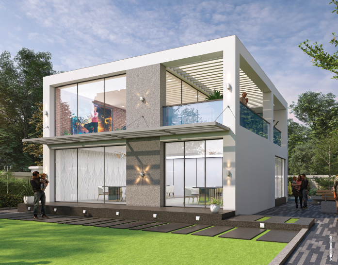 • 150mm thick external walls with double coat plaster in sand face finish.