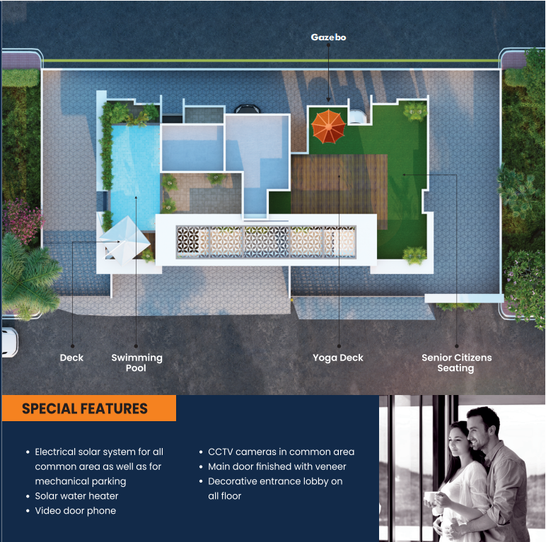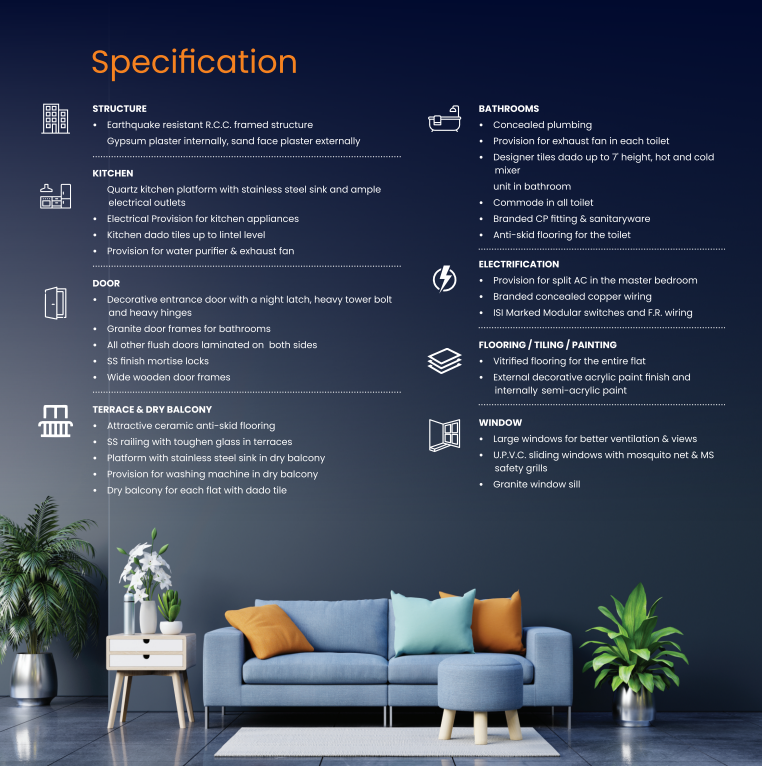 • Granite window sill - ELECTRICAL: • Provision for split AC in the master bedroom Branded concealed copper wiring ISI Marked Modular switches and F.R. wiring